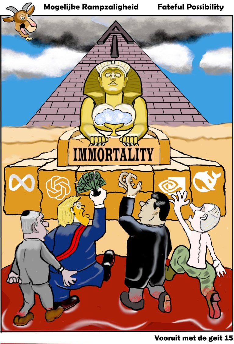 President Xi en President Poetin zouden onlangs tijdens een ontmoeting hebben gespeculeerd over onsterfelijkheid. De snelle ontwikkeling van kunstmatige intelligentie (AI) zou dit mogelijk kunnen maken. Alleen al de gedachte is huiveringwekkend. Het valt niet uit te sluiten, want AI-techbedrijven zijn niet alleen machtig en innovatief, maar ook bijzonder geheimzinnig. Voor het immense bouwwerk van AI staat op het altaar de Sfinx, die het bewaakt. De Sfinx is al eeuwenlang het symbool van raadsel-achtigheid, kennis en noodlot. De grote politieke wereldspelers zullen er alles aan doen om als eersten de graal van onsterfelijkheid te bemachtigen.